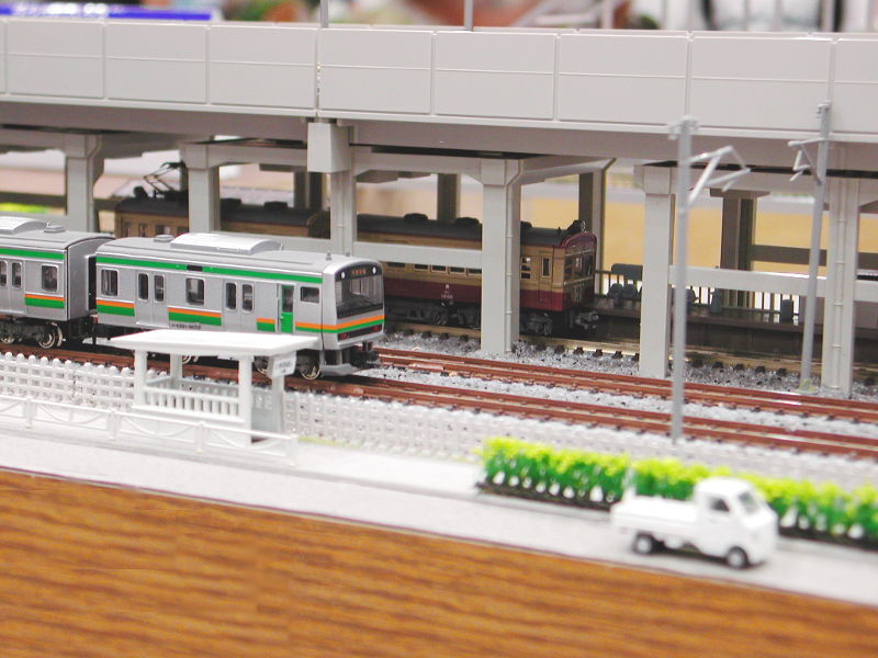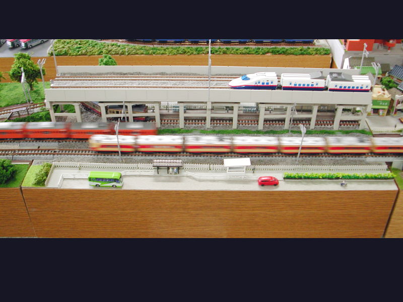 コメント新幹線、在来線、地方私鉄のある地域っぽくまとめてみました。 昔ながらの私鉄は、上を新幹線の線路に覆われて橋脚の間に追い込められる身になっています。